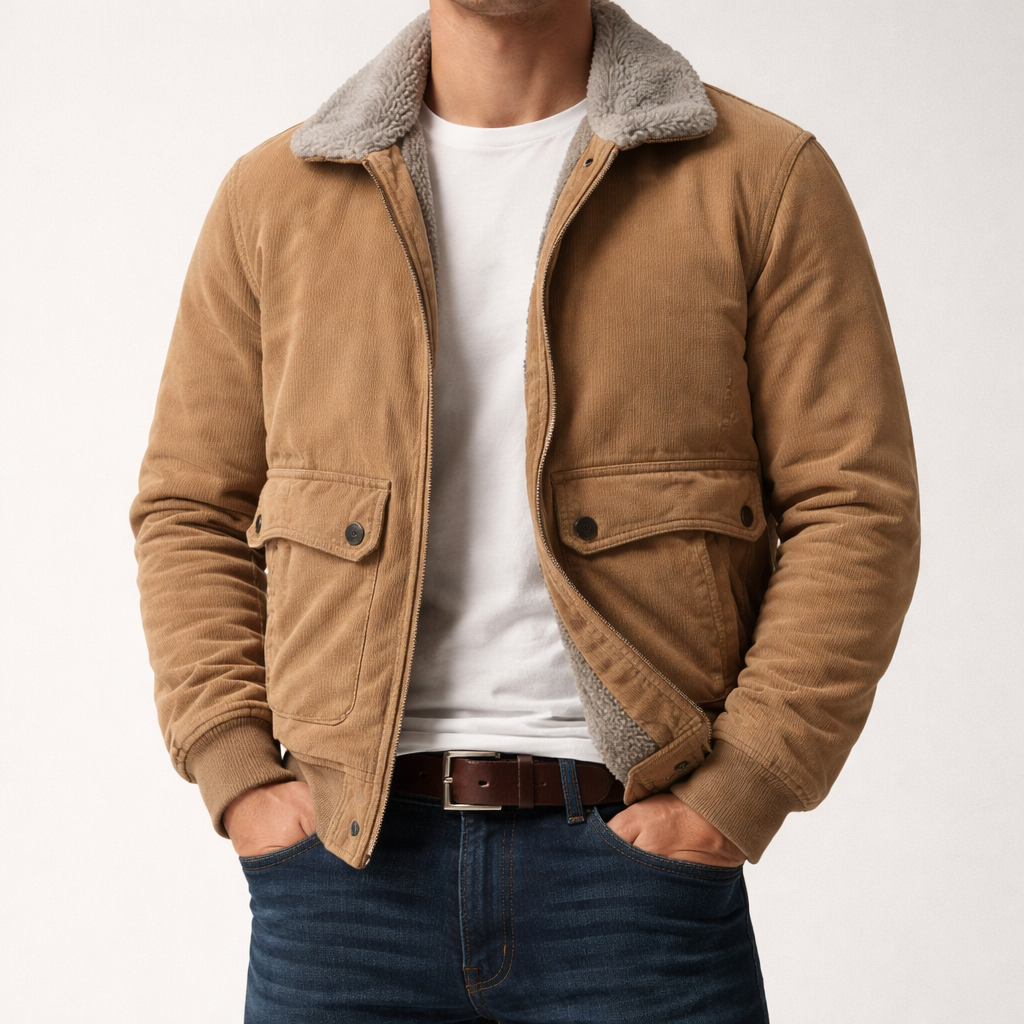 Iconic corduroy bomber pairs a textured corduroy exterior with a fully sherpa-lined interior for substantial, cold-weather warmth. A wide sherpa-covered collar and oversized front pockets give it a bold, winter-ready presence.
